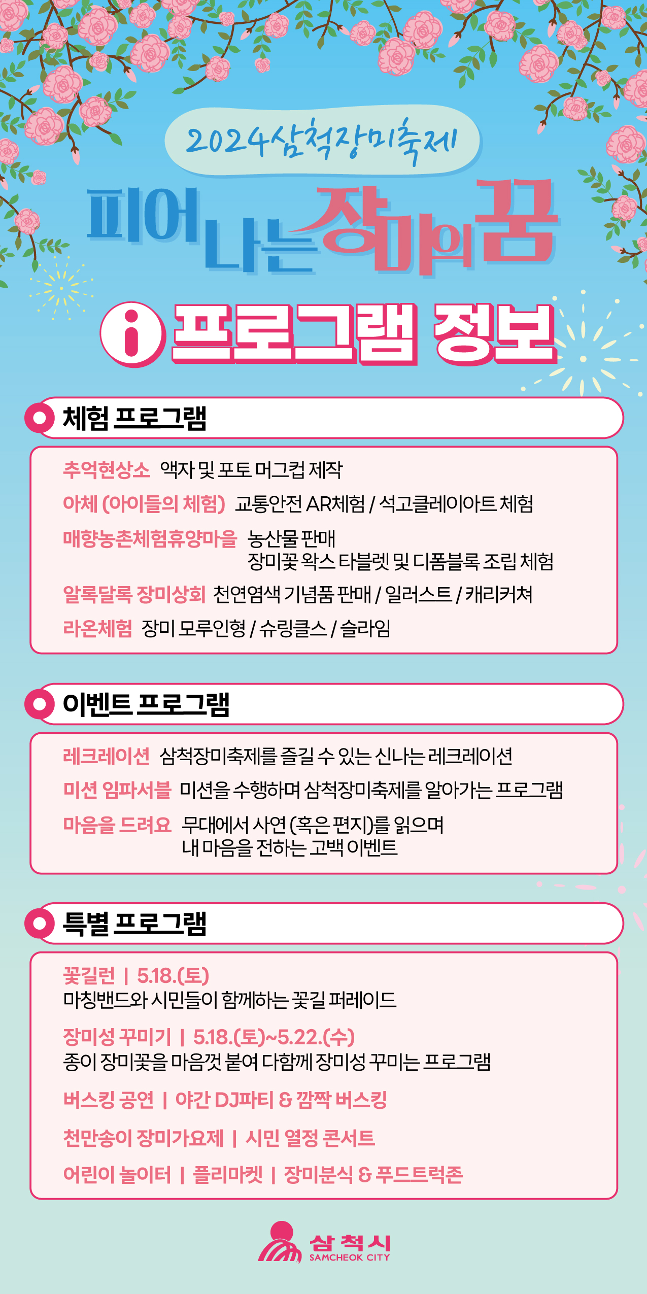 * 행사내용: 장미성 체험, 초청가수 공연, 버스킹 공연, 푸드트럭, 어린이 놀이터 조성